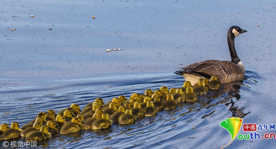 帶著一群幼鵝游泳的“鵝保姆”