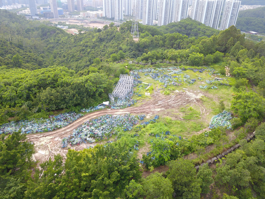7月27日下午,深圳新聞網(wǎng)記者前往安托山公園現(xiàn)場航拍。從無人機(jī)鏡頭里,記者的確在安托山公園山頂發(fā)現(xiàn)了大量共享單車,這些單車被無序堆放在山頂?shù)囊黄盏厣?,其中酷騎、小藍(lán)單車居多,此外還有少量摩拜、小黃等仍在運營的共享單車品牌的車輛,總數(shù)量估算有上千輛。