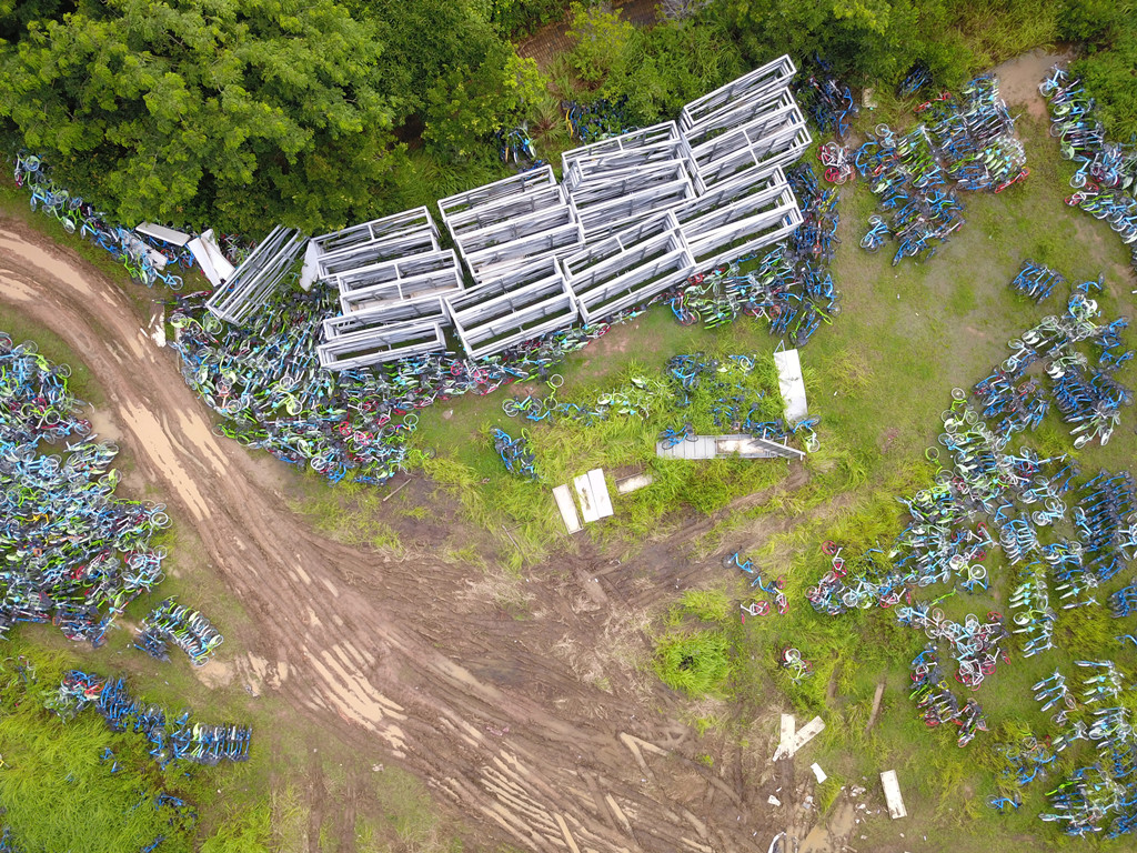 從高空俯瞰,安托山山頂?shù)墓蚕韱诬嚩逊e無序、且周圍雜草叢生,猶如一片共享單車“墳場”