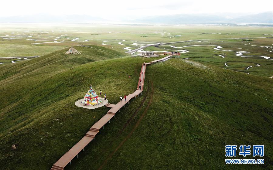游客在瑪曲縣阿萬(wàn)倉(cāng)濕地的觀(guān)景步道上游覽(7月31日無(wú)人機(jī)拍攝)。新華社記者 陳斌 攝