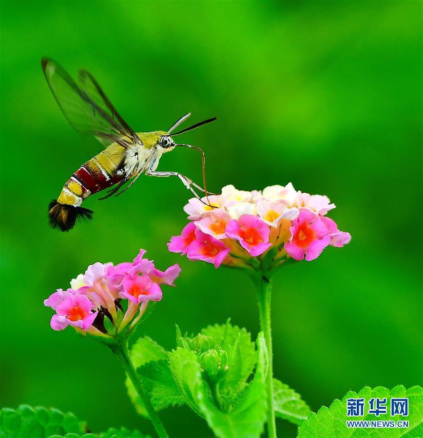 在福建省福州市溫泉公園,透翅天蛾在花間飛舞(8月18日攝)。近日,福建省福州市溫泉公園內(nèi)的馬纓丹大面積開放。花紅、草綠、蟲飛,構(gòu)成了一幅和諧的閩都生態(tài)圖景。 新華社記者梅永存攝