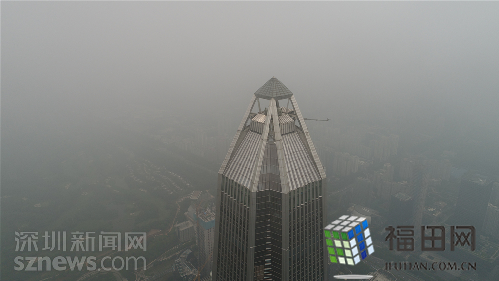記者在福田中心區(qū)看到,大量的灰霾籠罩在城市上空,不少著名的地標(biāo)性高樓大廈玩起了“隱身術(shù)”。比如,平安金融中心大廈若隱若現(xiàn),在上午11時(shí)、下午4時(shí)等灰霾最嚴(yán)重時(shí)候甚至完全看不見(jiàn)。記者操作無(wú)人機(jī)航拍福田中心區(qū)的灰霾情況,在海拔500米左右的高空,無(wú)人機(jī)的視線(xiàn)就被灰霾完全擋住。距離不足一百米的平安金融中心都看不見(jiàn)任何蹤影。