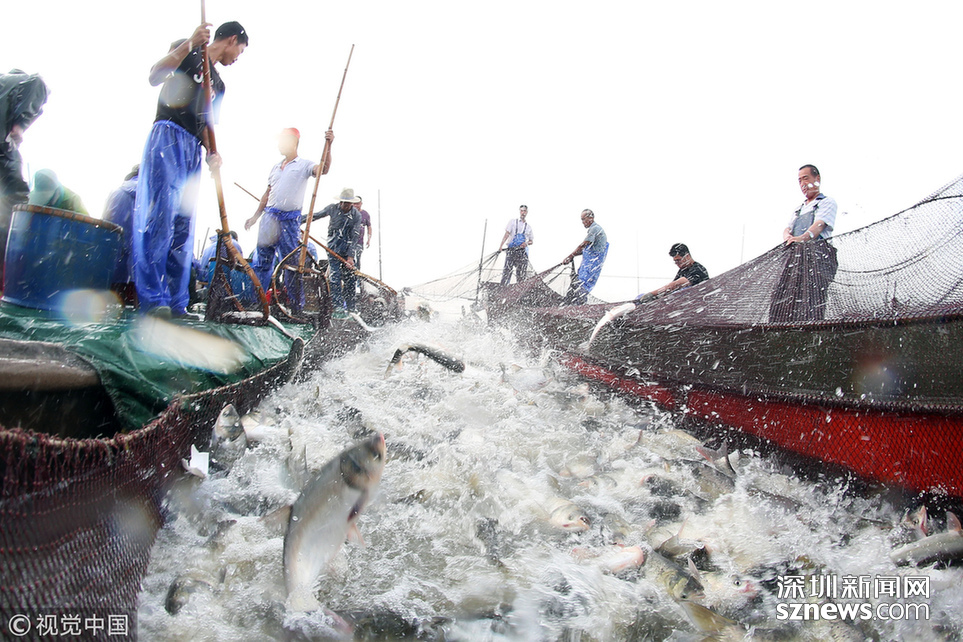 ??? 2018年6月26日,江蘇省常州市嘉澤鎮(zhèn)捕撈村的漁民組織夏季捕撈,一網(wǎng)魚達(dá)五萬余斤,以鰱魚為主,供應(yīng)市場需求。夏捕的魚價較平時有所上漲,漁民粗略估計可增收上萬余元。