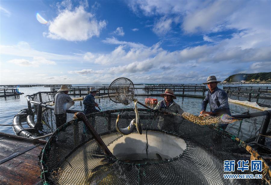 8月18日,南麂島海域內(nèi)的“海上牧場”養(yǎng)殖區(qū)內(nèi),漁民正捕撈大黃魚,處于仿生養(yǎng)殖環(huán)境的大黃魚需要生長2至3年。進(jìn)入8月,浙江省溫州市平陽縣南麂鎮(zhèn)海域上大片的大黃魚、貽貝等特色海產(chǎn)品養(yǎng)殖區(qū)域迎來豐收季節(jié),養(yǎng)殖戶們駕駛漁船在養(yǎng)殖區(qū)海域進(jìn)行打撈收獲,在碧海藍(lán)天下構(gòu)成了一幅“海上牧場”的美麗豐收景象。近年來,南麂鎮(zhèn)政府引導(dǎo)漁民養(yǎng)殖戶充分發(fā)揮“靠海吃?!钡馁Y源優(yōu)勢,大力發(fā)展海洋養(yǎng)殖經(jīng)濟(jì)和海島旅游經(jīng)濟(jì),實現(xiàn)了南麂由“生態(tài)美”向“產(chǎn)業(yè)美”,“產(chǎn)業(yè)美”向“經(jīng)濟(jì)美”的轉(zhuǎn)變。同時該鎮(zhèn)堅持以大黃魚、貽貝等為特色產(chǎn)業(yè)支撐,精準(zhǔn)發(fā)展高效海洋養(yǎng)殖業(yè),重點培養(yǎng)一批新型職業(yè)漁民,依靠專業(yè)技術(shù)支持,實現(xiàn)深海仿生養(yǎng)殖,讓好生態(tài)造就好品質(zhì),重點打造南麂養(yǎng)殖品牌,組建營銷網(wǎng)絡(luò),拓展特色海產(chǎn)品市場。新華社記者 徐昱攝