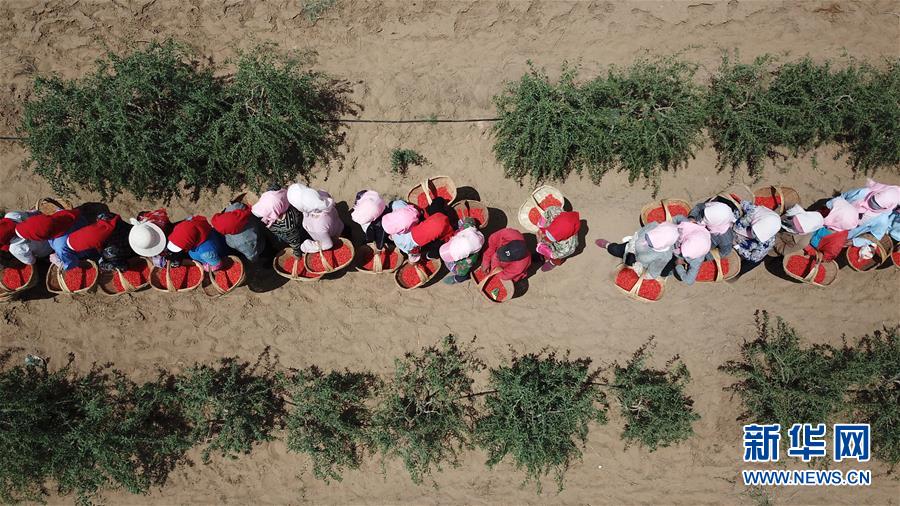紅寺堡生態(tài)移民區(qū)的移民在百瑞源枸杞種植基地排隊(duì)將采摘的枸杞稱重(5月30日無(wú)人機(jī)拍攝)。近日,在寧夏吳忠市紅寺堡區(qū)百瑞源枸杞種植基地,頭茬枸杞迎來(lái)采摘收獲季。今年頭茬枸杞采摘期比往年提前20天左右。據(jù)了解,該基地地處紅寺堡生態(tài)移民區(qū),占地3000畝,采摘季節(jié)每天有數(shù)百名當(dāng)?shù)匾泼裨谔镩g采摘?jiǎng)谧鳌P氯A社記者王鵬 攝