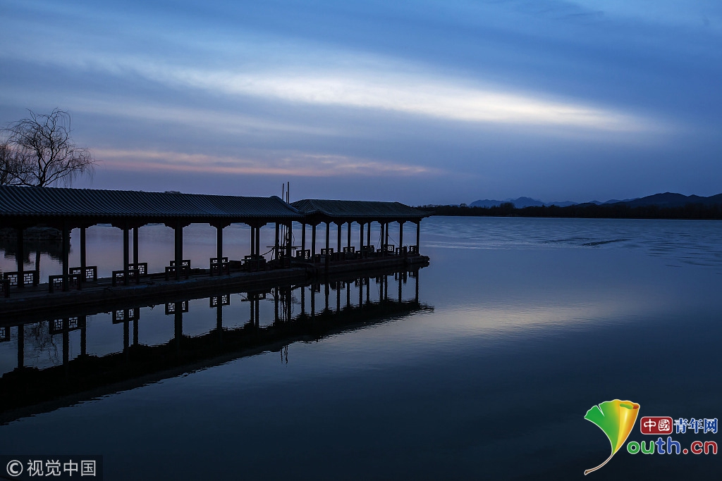 2018年2月23日,北京頤和園。當(dāng)天日落時(shí)分昆明湖上空出現(xiàn)夕陽余暉的美景,夢幻般的色彩將古老的皇家園林裝扮得美輪美奐,讓人流連忘返。來源:視覺中國