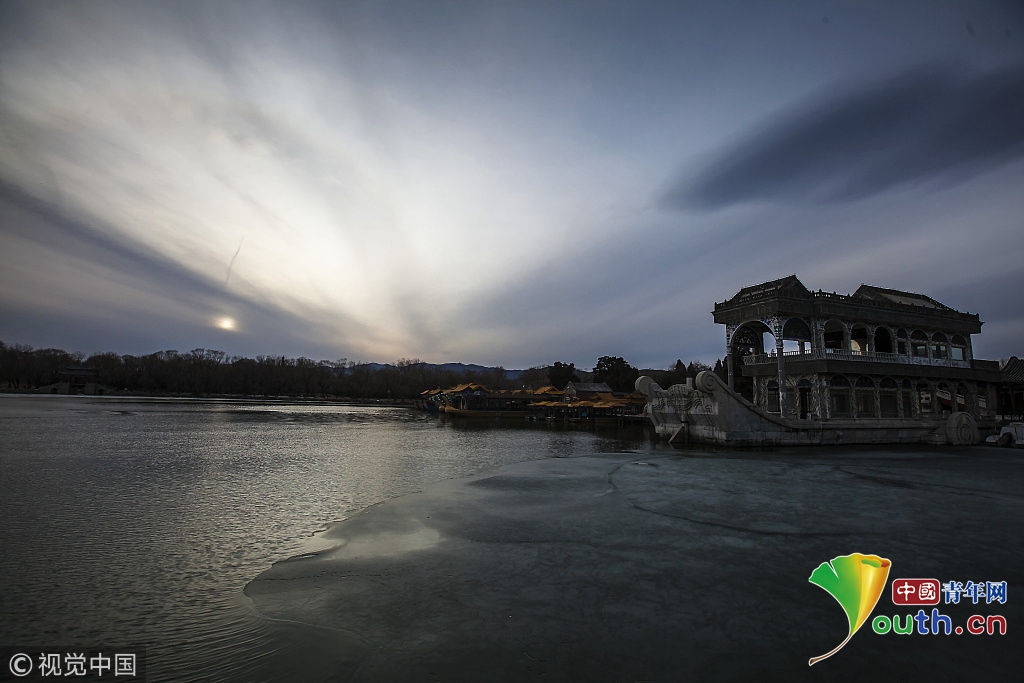 2018年2月23日,北京頤和園。當(dāng)天日落時分昆明湖上空出現(xiàn)夕陽余暉的美景,夢幻般的色彩將古老的皇家園林裝扮得美輪美奐,讓人流連忘返。
