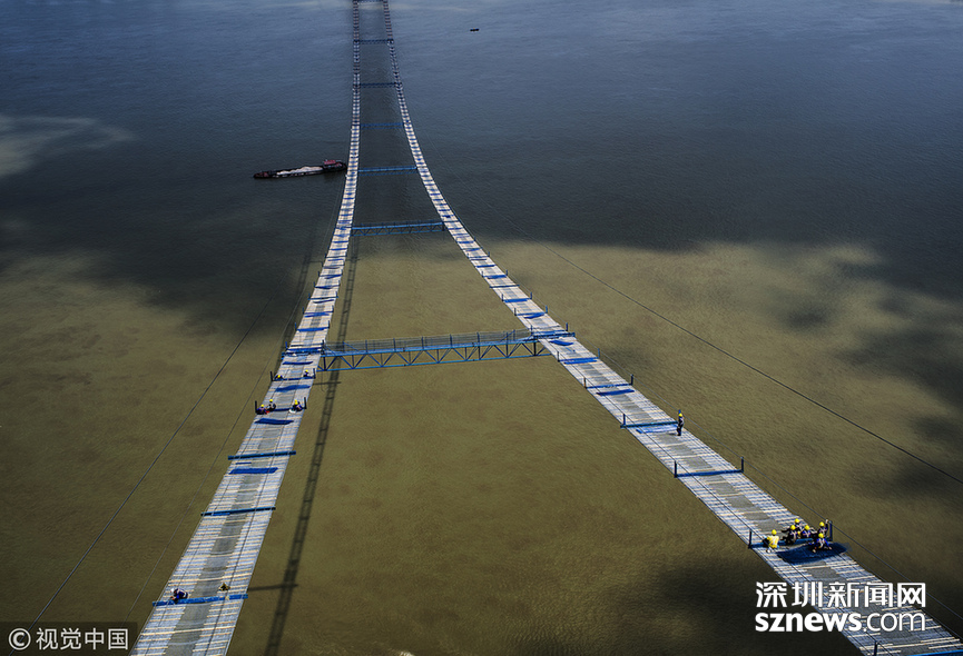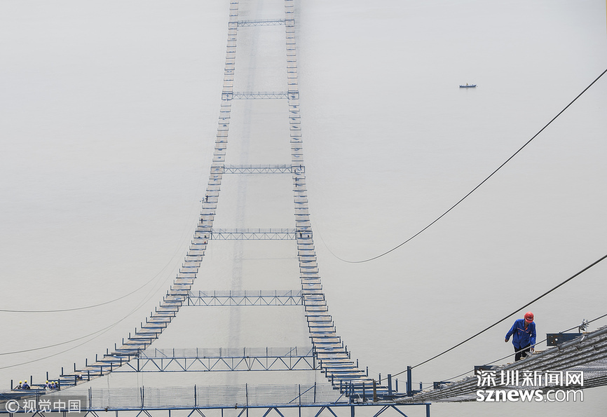 長江上空架“天梯” 武漢楊泗港長江大橋臨時“吊橋”形成