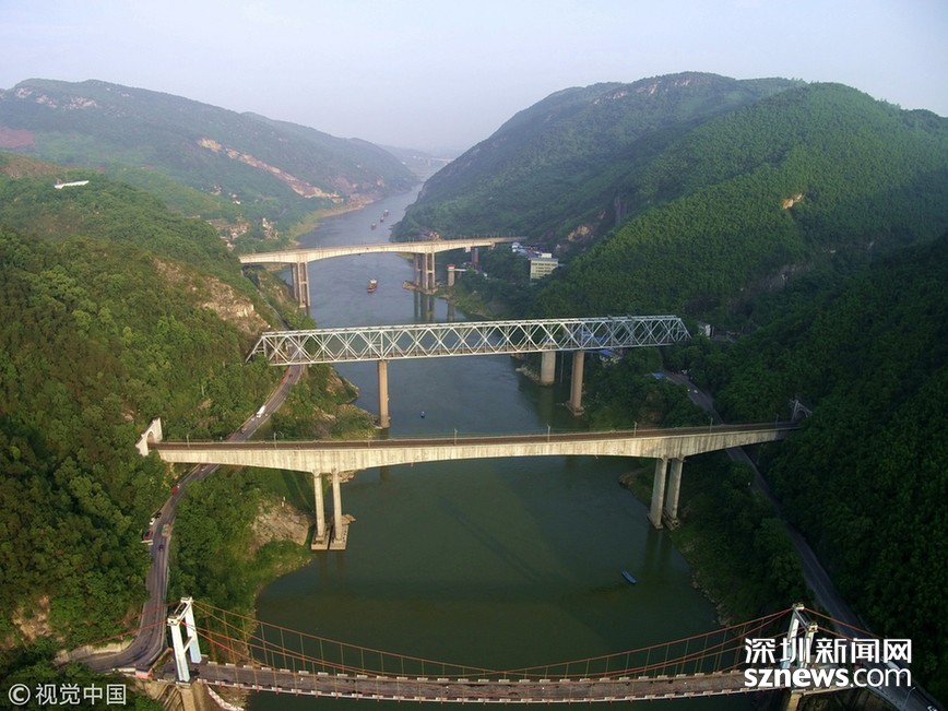 畫面中由近及遠分別是新朝陽橋、老朝陽橋、遂渝鐵路橋、襄渝鐵路橋、蘭渝鐵路橋。