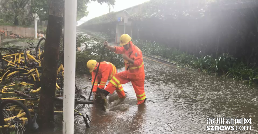 福田區(qū)位于北環(huán)皇崗立交,深圳市水務集團福田分公司梅林所防洪排澇人員,趁風勢雨小,打開雨水箅子排積水。