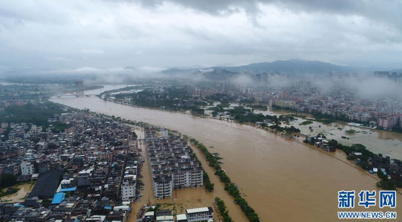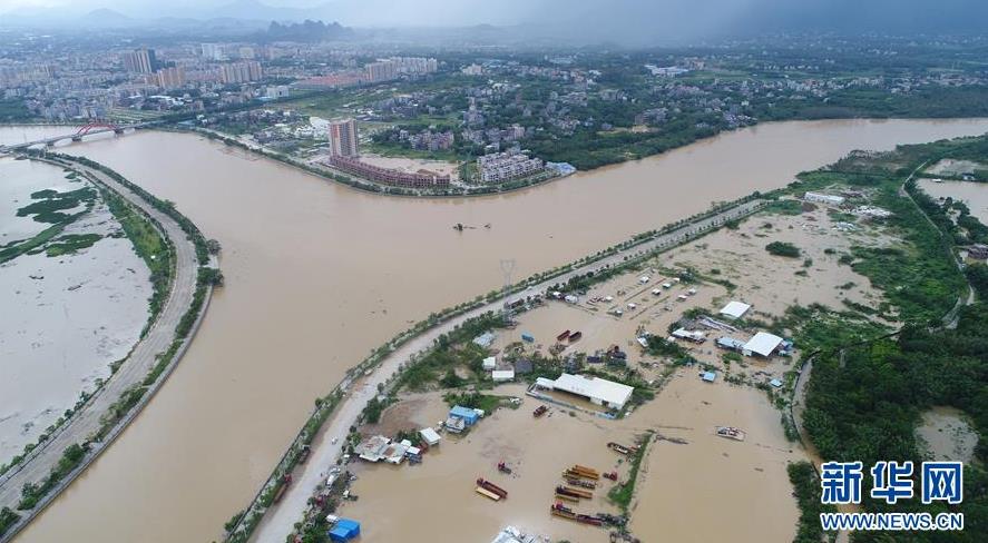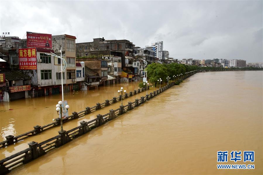 9月18日,陽(yáng)春市漠陽(yáng)江畔的街道被洪水淹沒(méi)。 新華社記者 周科 攝