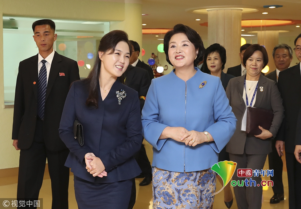 當(dāng)?shù)貢r(shí)間2018年9月18日,朝鮮平壤,韓國總統(tǒng)文在寅夫人金正淑在朝鮮國務(wù)委員會委員長金正恩夫人李雪主的陪同下參觀平壤金元均音樂大學(xué)。圖片作者:視覺中國