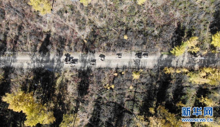 內(nèi)蒙古大興安嶺根河林業(yè)局約安里林場(chǎng)里的馴鹿(9月18日無(wú)人機(jī)拍攝)。新華社記者李任滋攝