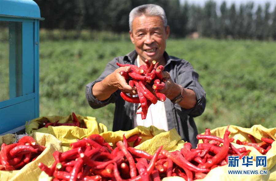 9月16日,阜城縣王集鄉(xiāng)南張莊村農(nóng)民在展示采摘的辣椒。近年來,河北省阜城縣王集鄉(xiāng)在推進(jìn)產(chǎn)業(yè)富民過程中,積極引導(dǎo)農(nóng)民調(diào)整農(nóng)業(yè)產(chǎn)業(yè)結(jié)構(gòu),按照品種特色化、種植規(guī)?;a(chǎn)銷一體化的“公司+基地+農(nóng)戶”的經(jīng)營模式,鼓勵農(nóng)民發(fā)展特色辣椒種植,推行“訂單種植”模式,開辟出了一條農(nóng)民創(chuàng)收新路徑。目前,阜城縣王集鄉(xiāng)辣椒種植面積3100余畝,每畝年收益2500元以上,帶動當(dāng)?shù)剞r(nóng)民實(shí)現(xiàn)增收。新華社記者朱旭東攝