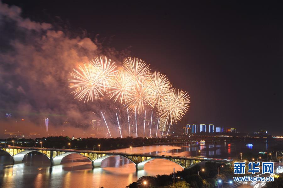 這是9月19日拍攝的長(zhǎng)沙湘江橘子洲焰火晚會(huì)現(xiàn)場(chǎng)。新華社記者 龍弘濤 攝