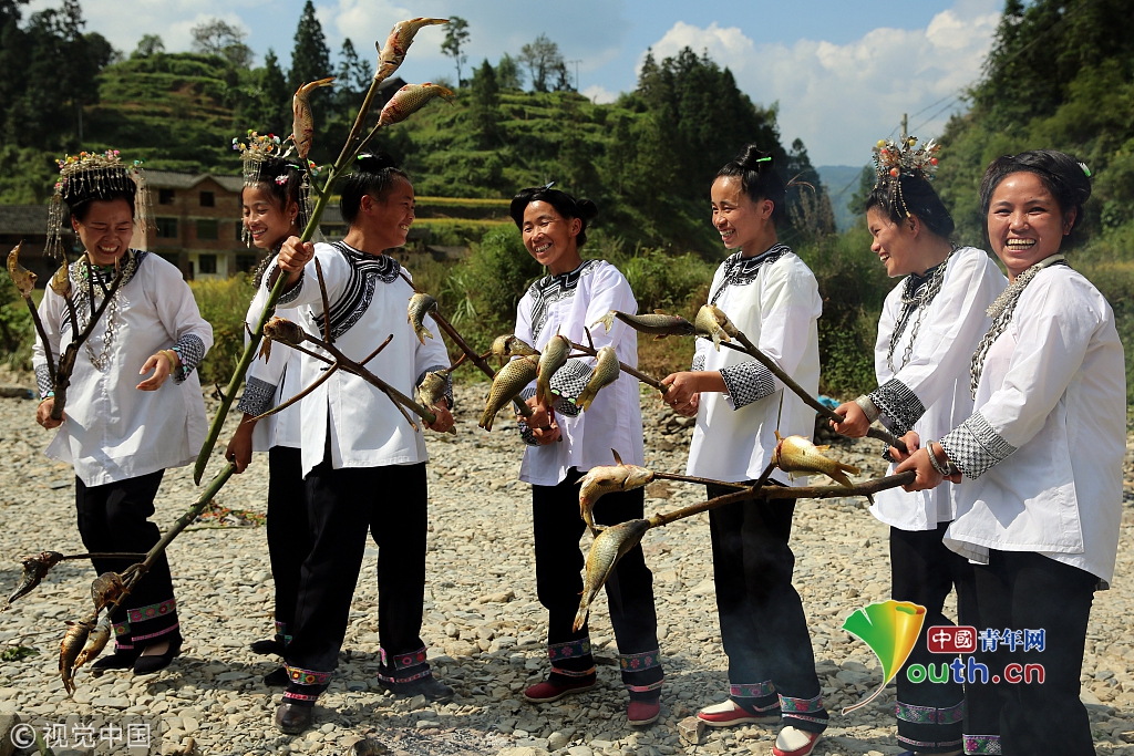 2016年9月17日,貴州省榕江縣平陽鄉(xiāng)硐里村七位侗家婦女們正燒魚。每年中秋時節(jié),當(dāng)?shù)囟弊逋_田放水,捉魚,全寨男女老少,野外生起篝火烤魚,用烤魚、米酒等,祭祀魚神,祈禱魚糧豐收的傳統(tǒng)民俗活動。
