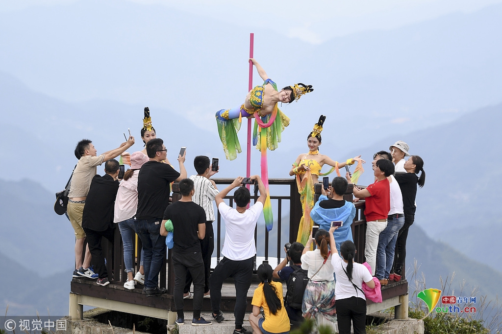 2018年9月20日,中秋節(jié)前夕,位于長三角第一高峰海拔1929米的浙江龍泉山頂,一場柔美的鋼管舞表演吸引了眾人圍觀。
