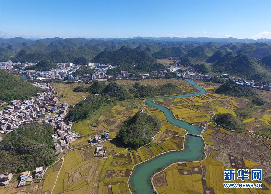 這是廣南縣八寶鎮(zhèn)壩龍村的田園景色(9月20日無人機拍攝)。 云南省文山壯族苗族自治州廣南縣八寶鎮(zhèn)今年種植優(yōu)質(zhì)水稻22000余畝,秋收季節(jié),田野里一片金黃,景色如畫。 新華社記者楊宗友攝