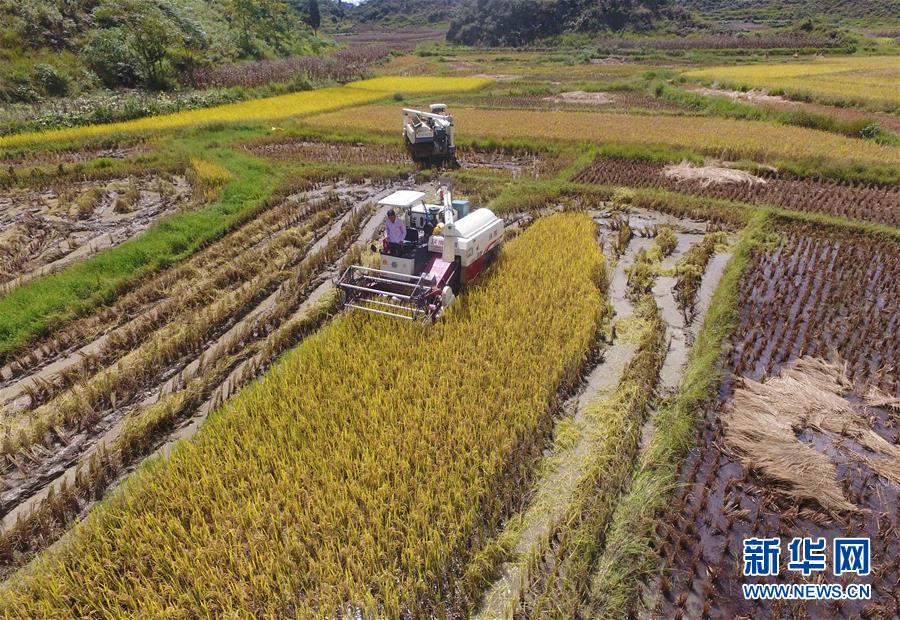 9月20日,廣南縣八寶鎮(zhèn)壩龍村的農民在用收割機收稻谷(無人機拍攝)。 云南省文山壯族苗族自治州廣南縣八寶鎮(zhèn)今年種植優(yōu)質水稻22000余畝,秋收季節(jié),田野里一片金黃,景色如畫。 新華社記者楊宗友攝
