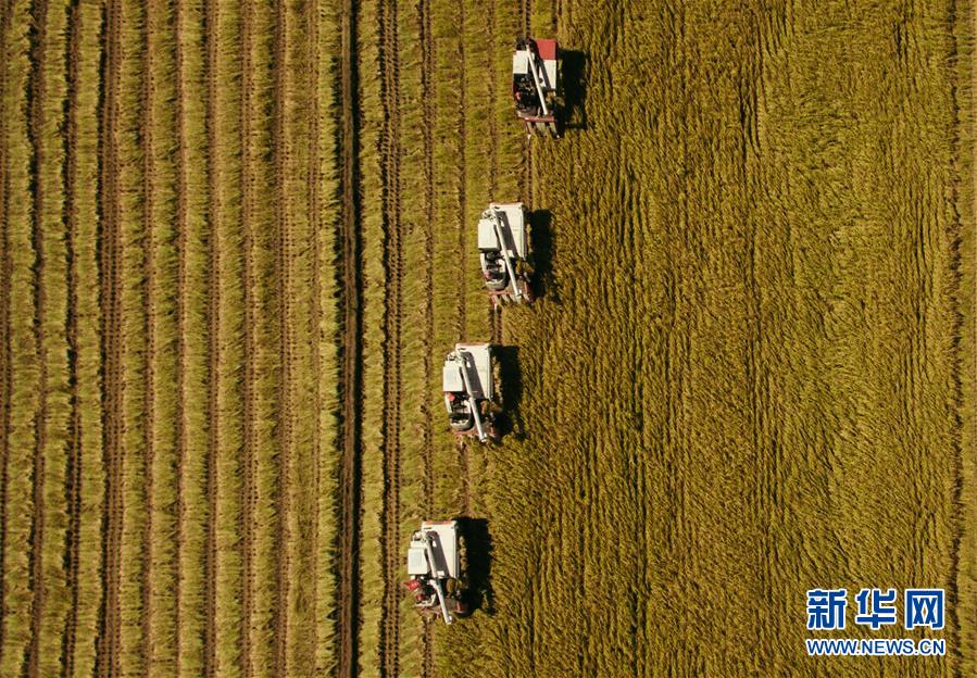 在吉林省吉林市萬昌鎮(zhèn),農(nóng)民在張楠楠成立的家庭農(nóng)場(chǎng)的稻田間駕駛收割機(jī)收割水稻(9月18日攝)。 新華社記者 許暢 攝