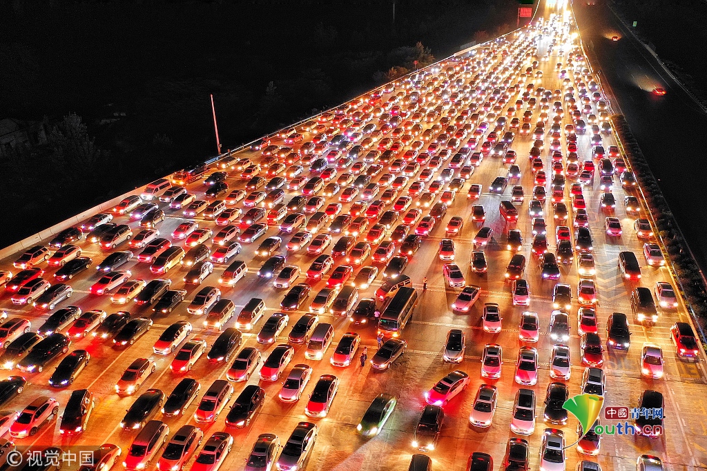 從天上鳥瞰,車輛的尾燈宛若一條紅色的巨龍,望不到盡頭,場(chǎng)面十分壯觀。