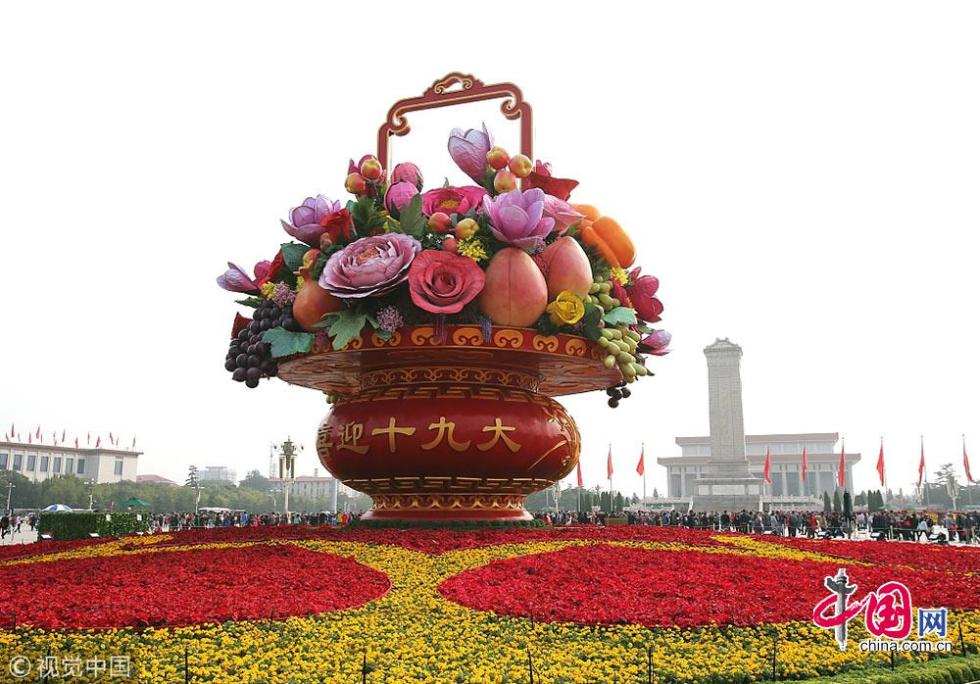 2017年天安門廣場大花籃以喜慶的花果籃為主景,花籃頂高17米,籃體高15.3米,底部直徑達(dá)50米。籃體南側(cè)寫有“祝福祖國、1949-2017”,北側(cè)寫有“喜迎十九大” 字樣?;ü@內(nèi)共使用主花56朵(牡丹、月季、玉蘭、金桂、迎春花、蘋果花、紫藤花、文心蘭、葉子花),其中最大牡丹直徑3.2米,果實(shí)6種(石榴、桃、柿子、蘋果、海棠、葡萄)。寓意吉祥的果實(shí)和花卉,象征十八大以來,黨和國家在各個領(lǐng)域取得的輝煌成就,碩果累累。底部花壇采用心形圖案,寓意紅心向黨,象征著全國人民緊密團(tuán)結(jié)在以習(xí)近平同志為核心的黨中央周圍,表達(dá)對祖國繁榮富強(qiáng)、欣欣向榮的美好祝福。