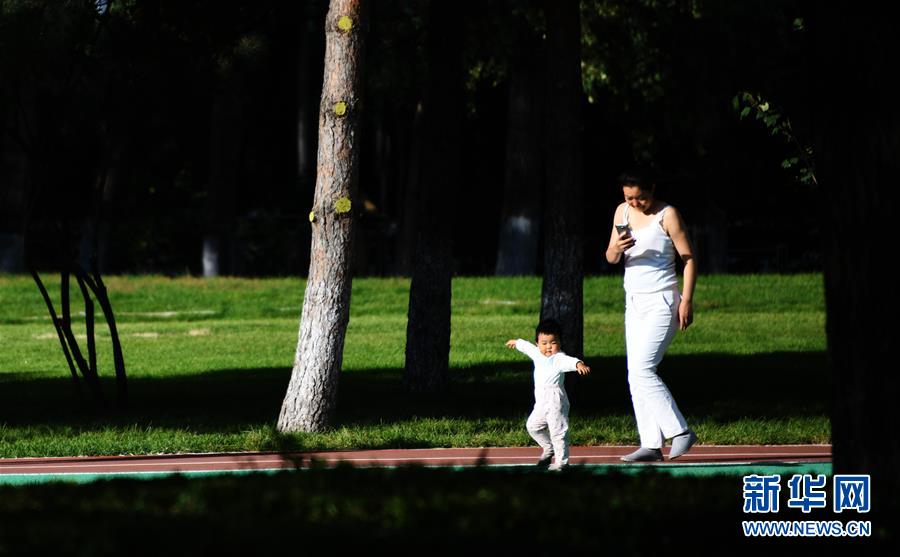 9月25日,一名家長帶著孩子在湘江公園內游玩。 當日,哈爾濱市湘江公園正式開園迎客。這個集休閑、健身、娛樂、觀賞于一體的多功能都市公園由高爾夫球場改造而成,免費對市民和游客開放。 新華社記者 王建威 攝