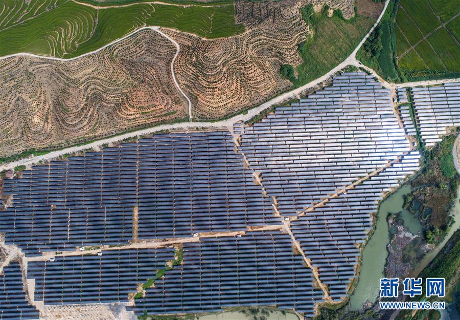 空中俯瞰湖州市埭溪鎮(zhèn)東紅村的光伏發(fā)電站(9月26日無人機拍攝)。該光伏電站占地2500多畝,是當?shù)貜U棄礦坑通過改造建成的“農(nóng)光互補”光伏發(fā)電站。