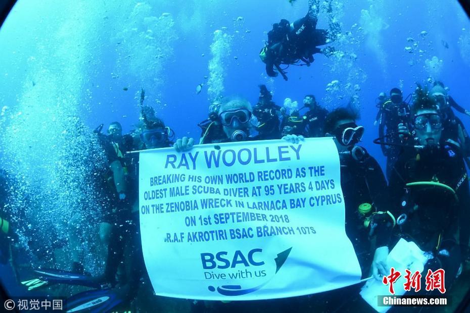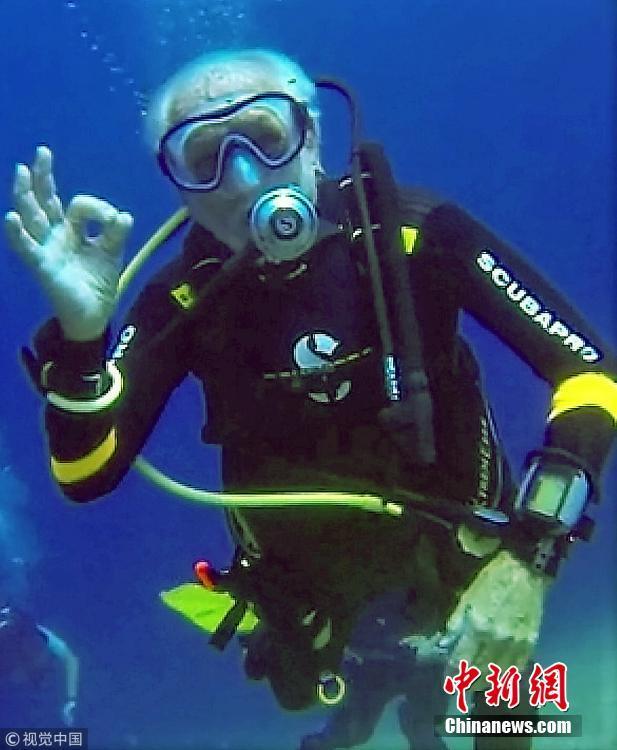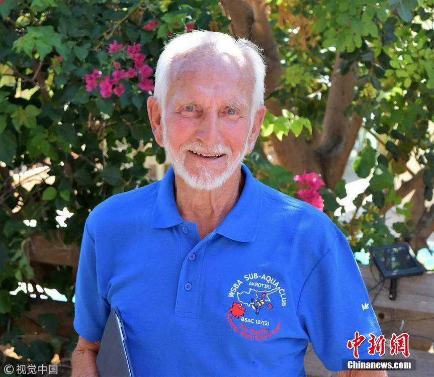 當(dāng)?shù)貢r間2018年9月1日,塞浦路斯,95歲的英國潛水員雷·伍利(Ray Woolley)以44分鐘下潛40.5米的成績打破了自己94歲達(dá)成的記錄(41分鐘下潛38.1米),二度刷新了世界上年齡最大的男性潛水員最好成績。在此次下潛中,這位二戰(zhàn)退伍老兵對距塞浦路斯南部城鎮(zhèn)拉納卡約2公里處的海域進(jìn)行了探索,1980年一艘名為“芝諾比亞號”(Zenobia)的貨船在這里進(jìn)行首次航行時沉沒。圖片來源:視覺中國