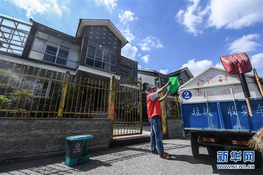 9月27日,小浦鎮(zhèn)合溪村垃圾分類清運員符正芳在清運村民門口的分類垃圾桶,同時他還要用手機上的垃圾分類APP進(jìn)行掃碼簽到,確保每天每戶清掃到位。從9月初開始,浙江省長興縣小浦鎮(zhèn)推廣使用手機垃圾分類智能管理平臺。通過這款A(yù)PP可以進(jìn)行村民垃圾分類情況打分、清運員每日簽到、監(jiān)督員巡查等,并能即時生成農(nóng)戶垃圾分類“成績單”,所有農(nóng)戶均可通過APP查詢垃圾分類排行榜,既方便又環(huán)保。新華社記者 徐昱 攝