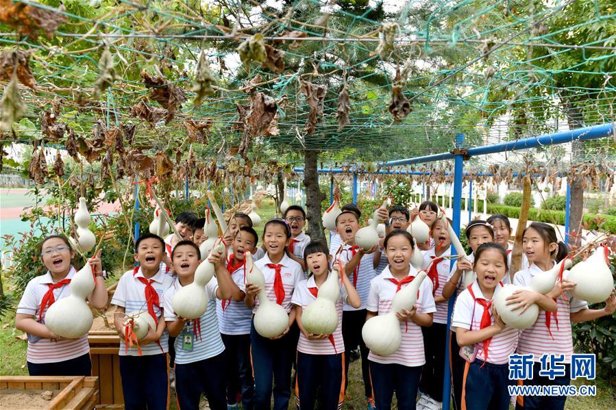 9月29日,在威海市經(jīng)濟技術開發(fā)區(qū)新都小學,學生展示采摘的葫蘆。新華社記者郭緒雷攝