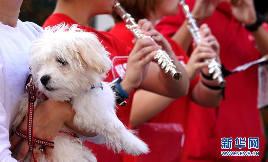 9月29日,在美國加利福尼亞州伯林蓋姆市,一支學(xué)生樂隊參加寵物狗大游行活動。美國加州舊金山灣區(qū)的伯林蓋姆市29日舉行寵物狗大游行活動。新華社記者吳曉凌攝