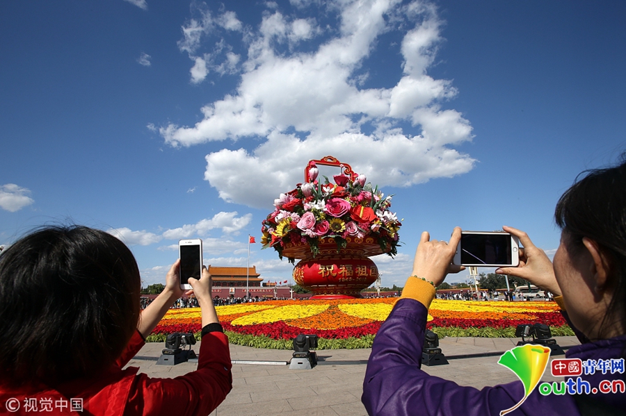 2018年9月29日,北京迎來高顏值好天氣,天安門廣場“祝福祖國”花壇在藍天白云映襯下壯美如畫。游客紛紛拿起手機、相機拍照留影充滿節(jié)日氣氛。