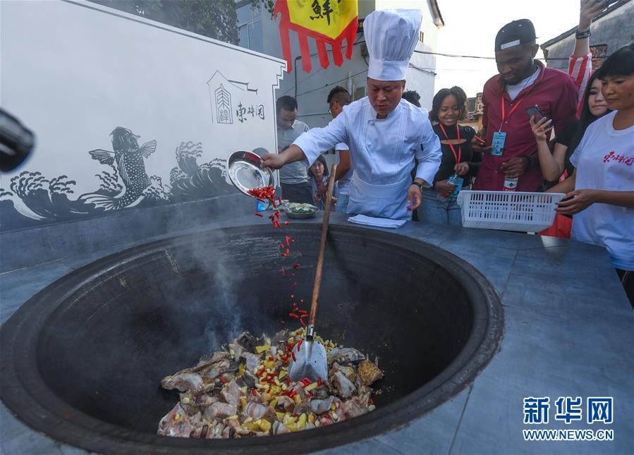 9月30日,廚師在中外游客的圍觀下烹飪“江鮮第一鍋”。當(dāng)日,浙江省杭州市富陽區(qū)場口鎮(zhèn)東梓關(guān)村開啟“江鮮第一鍋”,幾位大廚聯(lián)手在直徑1.5米的大鍋內(nèi)烹制美味江鮮,這也是當(dāng)?shù)亍敖r大會”的重頭戲。東梓關(guān)村有著1000多年歷史,古就是富春江南岸重要的商貿(mào)集散地,素有富春江“東流第一關(guān)”之稱。隨著近年來美麗鄉(xiāng)村建設(shè)的推進(jìn),東梓關(guān)村著力打造粉墻黛瓦的江南民居,同時依托富春江豐富的江鮮魚類資源,在秋季舉辦特色“江鮮大會”,通過江鮮捕撈體驗、江鮮第一鍋、百鮮宴、農(nóng)家菜大賽等活動,吸引各地游客前來感受富春江漁民豐收的喜悅和千年古村的獨特魅力,推動鄉(xiāng)村特色旅游發(fā)展。新華社記者徐昱攝