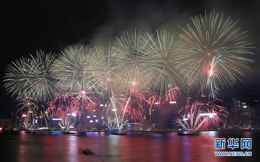 這是10月1日晚拍攝的香港維多利亞港煙花匯演。當(dāng)晚,香港維多利亞港舉行煙花匯演,慶祝中華人民共和國成立69周年。新華社記者李鋼攝