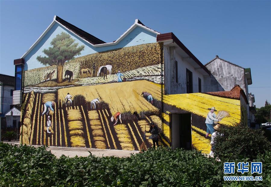在上海市金山區(qū)呂巷鎮(zhèn)和平村,村民房屋的墻壁上繪制了色彩艷麗、風(fēng)格各異的壁畫,展現(xiàn)田園生活景象,吸引不少游人來此參觀。