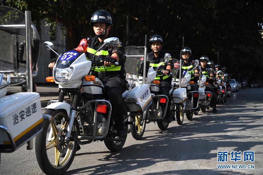 10月1日,廣西南寧市公安局南湖分局治安巡邏隊在南寧市東葛路上巡邏。當日是國慶節(jié),許多勞動者堅守在工作一線,在崗位上度過節(jié)日。新華社記者周華攝