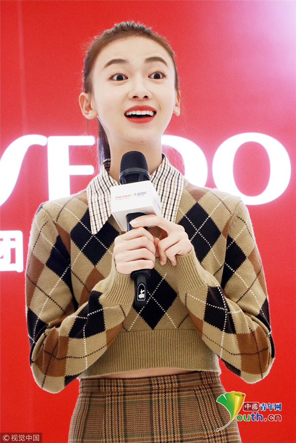 吳謹(jǐn)言穿學(xué)院風(fēng)套裝梳馬尾 甜笑比心少女范十足