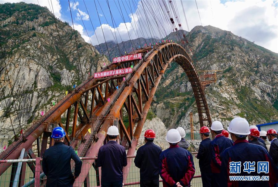 9月28日拍攝的川藏鐵路拉林段重點標志性工程藏木特大橋合龍儀式現(xiàn)場。 當日,隨著最后一節(jié)鋼管拱的對位和鎖定完畢,川藏鐵路拉林段藏木特大橋成功合龍,標志著大橋主體結(jié)構(gòu)施工取得了關(guān)鍵性勝利。藏木特大橋由中國中鐵廣州局集團承建,拱高112米,橋橫跨雅魯藏布江峽谷,水深66米。 新華社記者普布扎西攝