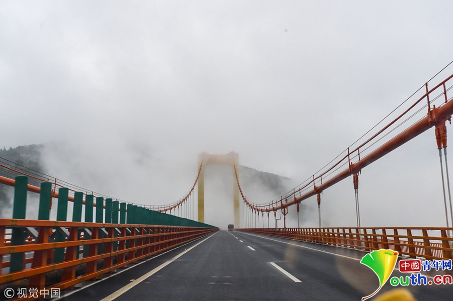 8月27日,位于貴州省甕安縣的清水河大橋云霧繚繞,景色如畫。