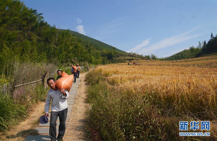 10月9日,村民在上堡鄉(xiāng)的高山梯田將收割完的稻谷運送下山。 新華社記者 胡晨歡 攝