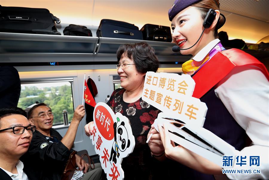 10月10日,G2次列車乘務(wù)員向旅客講解首屆中國國際進口博覽會相關(guān)信息。 新華社記者陳飛攝