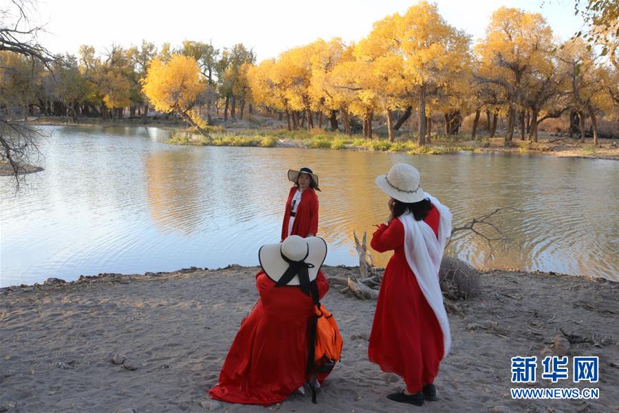 10月10日,在內(nèi)蒙古自治區(qū)額濟(jì)納旗,游客在胡楊林前留影。 金秋時(shí)節(jié),內(nèi)蒙古自治區(qū)額濟(jì)納旗胡楊林如同披上金裝,成為大漠中的一抹亮色,吸引眾多中外游客前來觀賞游玩。 新華社記者安希雅攝