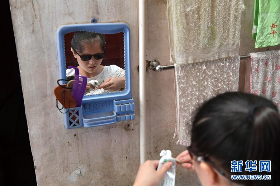 楊虹的母親謝年華(右)在家中給她扎辮子(9月26日攝)。新華社記者 彭昭之 攝