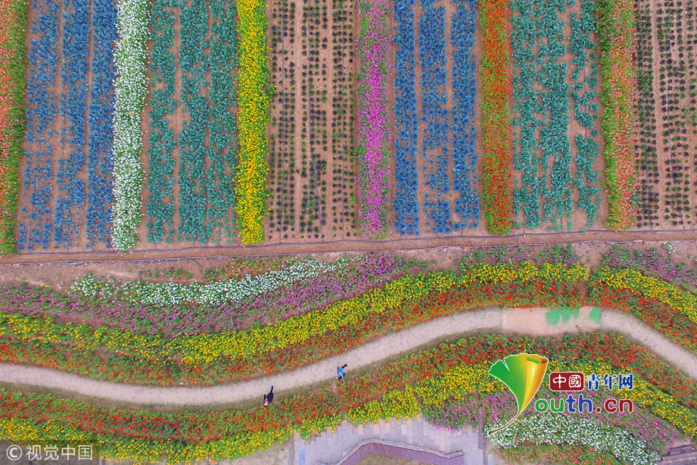 2018年10月14日,江蘇南京,江寧區(qū)谷里街道徐家院村的50萬(wàn)株百日菊競(jìng)相綻放,大紅、黃色、紫色……遠(yuǎn)遠(yuǎn)望去仿佛是田野間鋪上一層“五彩地毯”, 成了金秋里一道花宴盛景,吸引不少游人徜徉其中。圖片作者:方東旭/視覺(jué)中國(guó)