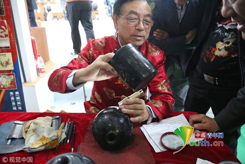 2018年10月14日,山東濟(jì)南,高新會(huì)展中心濟(jì)南文博會(huì)現(xiàn)場(chǎng),張務(wù)福老先生在黑陶鼎上刻字。
