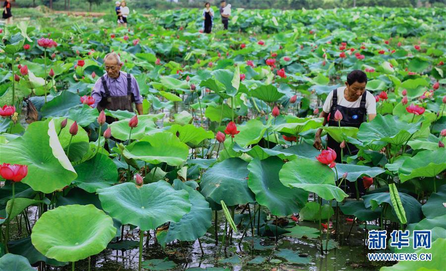 6月3日,荷農(nóng)們在荷花基地里挑選準備出售的觀賞性荷花。新華社記者 徐昱 攝
