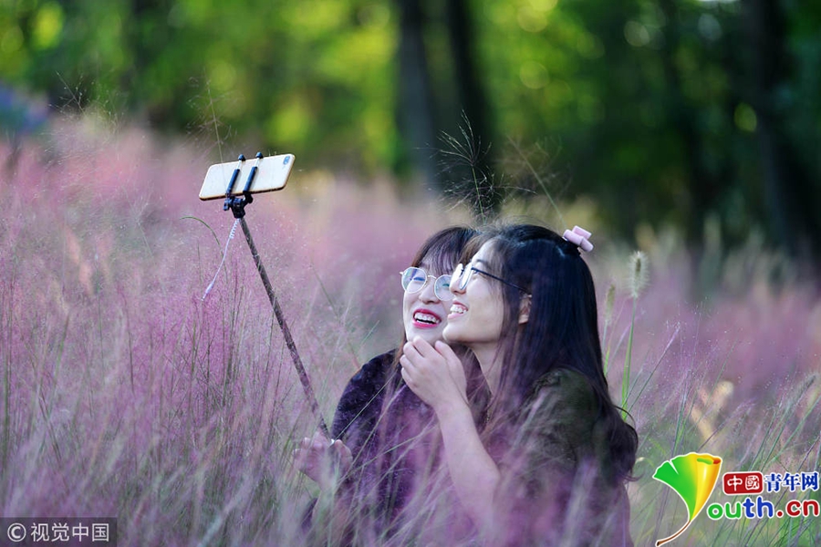 中國青年網(wǎng)北京10月7日電 2018年10月6日,游客在“粉色田野”里游玩、留影。粉黛亂子草是一種觀賞草種,該植物夏季為主要生長季,全株綠色,花期為9月中旬至11月中旬,開花時,綠葉為底,粉紫色花穗如發(fā)絲從基部長出,遠(yuǎn)看如紅色云霧。
