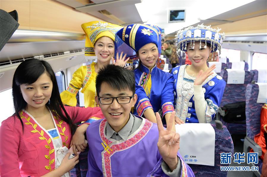 在廣西南寧站,身著民族服裝的乘客搭乘動車準(zhǔn)備出行(2013年12月30日攝)。 廣西壯族自治區(qū)成立60年來,鐵路建設(shè)發(fā)生翻天覆地的變化。來自中國鐵路南寧局集團(tuán)有限公司的數(shù)據(jù)顯示,1958年廣西鐵路總里程為1346.3公里,如今廣西鐵路總里程達(dá)5191公里。廣西與周邊相鄰省份間實(shí)現(xiàn)動車“公交化”開行。此外,北部灣港—重慶班列、東盟海產(chǎn)品冷鏈班列、“百色一號”果蔬專列等的開通和運(yùn)營,強(qiáng)化了鐵路供給的針對性和有效性。鐵路成為助推廣西經(jīng)濟(jì)社會快速發(fā)展的“大動脈”。 新華社記者周華攝