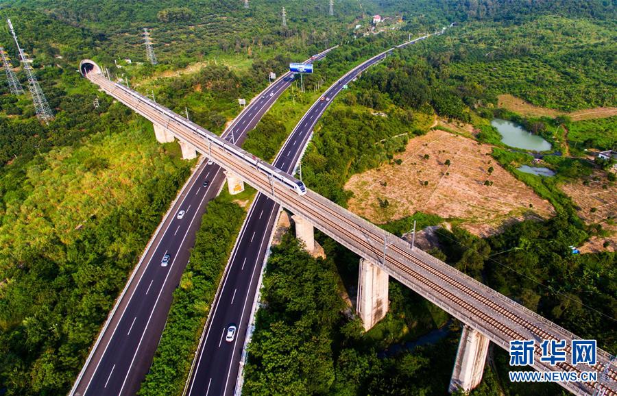這是2016年10月11日無人機(jī)拍攝的海南環(huán)島高鐵東線三亞段。新華社記者 楊冠宇 攝